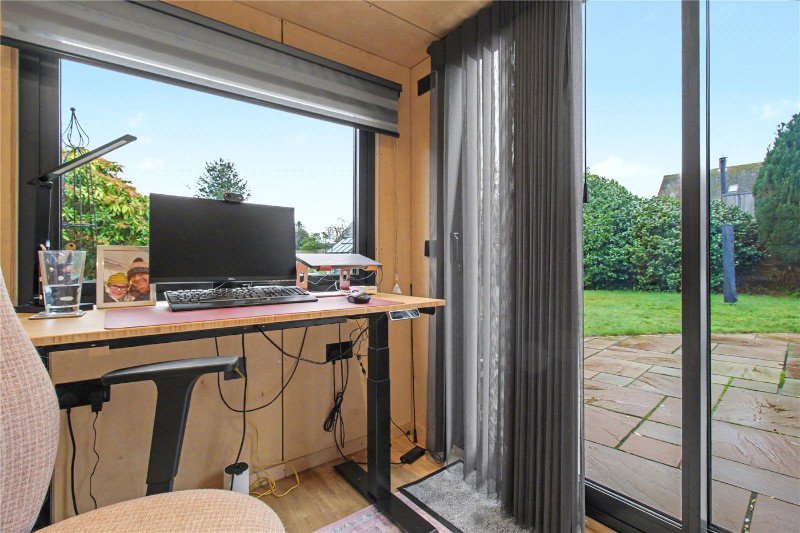 Outside, the rear garden is a true highlight, unusually generous for the location and ideal for families, keen gardeners, or those simply seeking space to relax. The grounds are predominantly laid to lawn with a terraced patio directly behind the bungalow—perfect for entertaining or al fresco dining. A fully insulated okopod studio, complete with power, lighting, air conditioning and heating, provides a versatile additional space currently used as a study but equally suited to hobbies or home working.