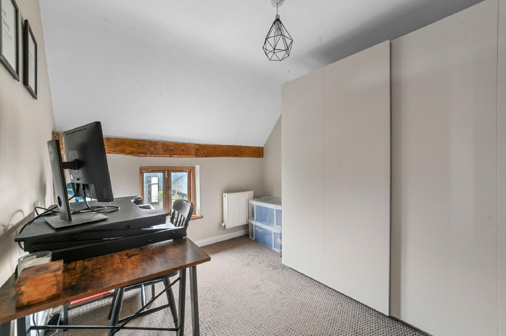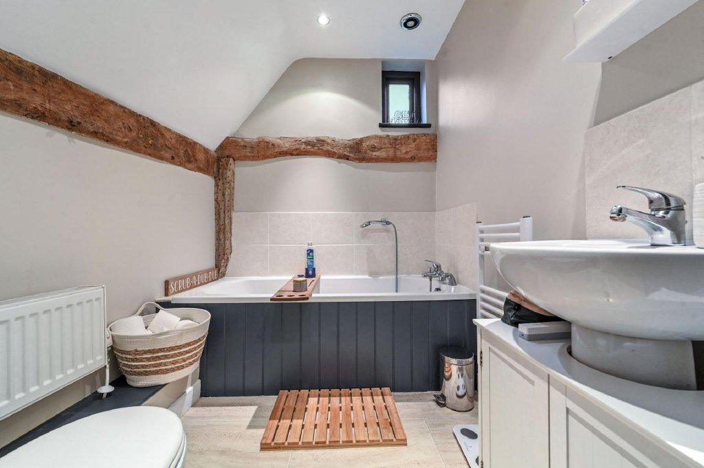 The home offers three comfortable, characterful bedrooms, each thoughtfully presented. The principal bedroom benefits from an en-suite shower room, featuring a delightful pop of colour that adds fantastic personality and vibrancy to the space. A well-equipped family bathroom, complete with weathered beams again, serves the remaining bedrooms, combining practicality with understated style. All the bedrooms are aligned at the back of the property and get plenty of light too.