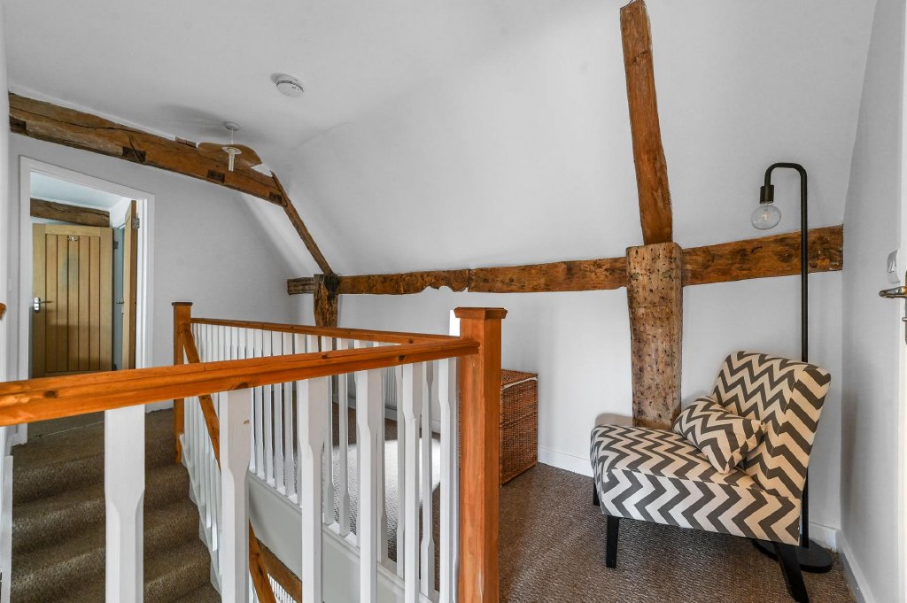 Stepping through the practical porch into the internal hallway, the utility room is straight ahead, perfect for taking off walking boots and coats, school bags, and footy kits! Tucked behind the door, is the cupboard with the water heater and to the right is the ground floor cloakroom. At the heart of the home lies a spacious kitchen with generous storage and workspace, making creating a culinary feast an enjoyable task. The hallway then leads to an L - shaped dining area, thoughtfully designed for both everyday living and entertaining. The current owners have held fabulous Christmas dinners here, hosting 14 around the table and then sprawling out to the sitting room for a snooze or to play games. The layout allows for connection and flow while maintaining defined, welcoming spaces. A door from the dining room leads to the generous sitting room, warm and inviting, centred around a handsome exposed brick fireplace where if desired, an electric log burner could be installed, perfect for cosy evenings throughout the seasons. A soft, natural colour palette flows throughout the home, allowing weathered beams to take centre stage and offering a refined yet neutral canvas ready for you to add your own individual touch. Character features abound, including beautifully wonky beams that celebrate the property's heritage, harmoniously balanced with modern comforts for contemporary living.
