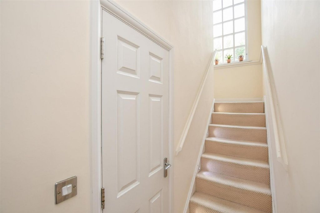 The welcoming entrance hall sets the tone, leading into a bright and spacious lounge/dining room with dual-aspect windows and soaring ceilings that flood the room with natural light. The separate fitted kitchen opens directly onto your own private patio – perfect for morning coffees, al fresco dining, or simply unwinding outdoors. A handy cloakroom and generous storage cupboard complete the ground floor.