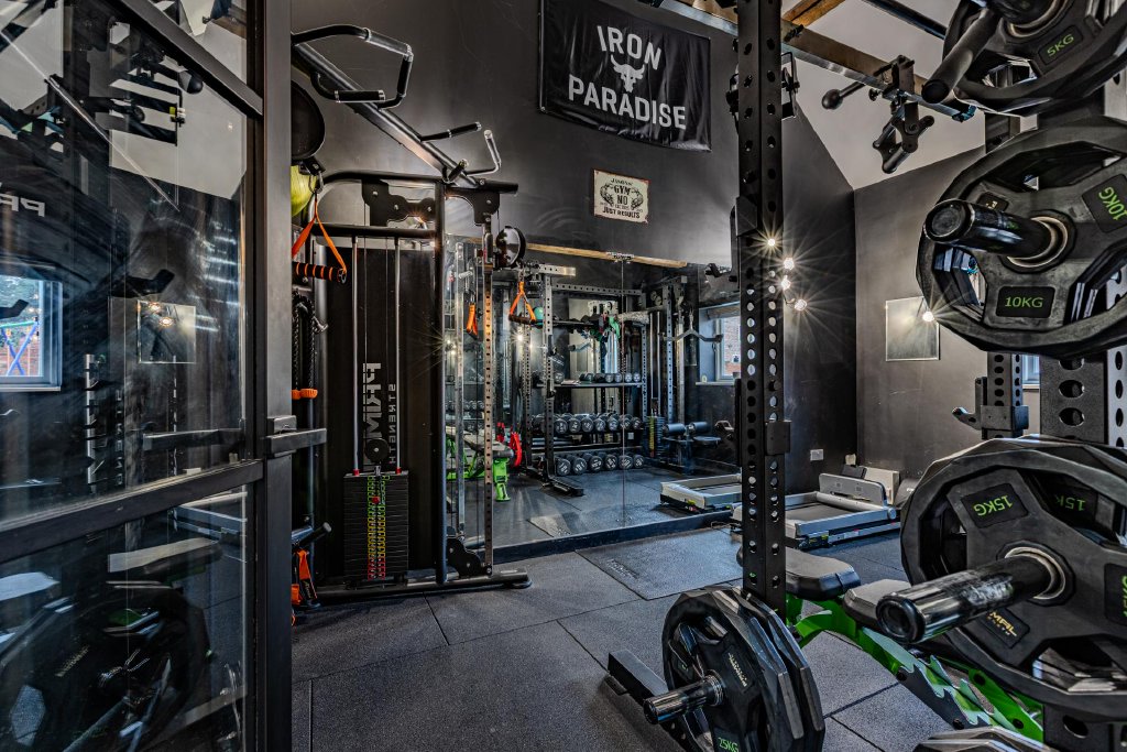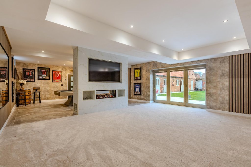The ground floor continues to impress with a separate playroom, a fully equipped home gym of exceptional quality, and an outstanding open-plan living area centered around a bespoke entertainment wall and a striking double-sided fireplace. Expansive bi-fold doors open onto the private rear garden, creating a seamless connection between indoor and outdoor living. To the opposite side of this space lies a beautifully appointed games room, currently featuring a distinctive pool table and offering versatile recreational possibilities.