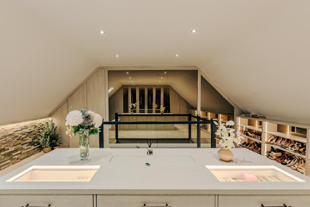 The second floor provides two further bedrooms, extensive loft storage and a stunning dressing room fitted with bespoke wardrobes and six full-length mirrored doors, delivering a boutique feel alongside exceptional practicality.
