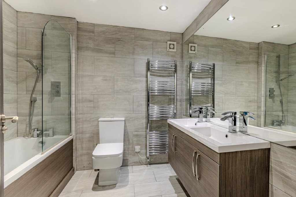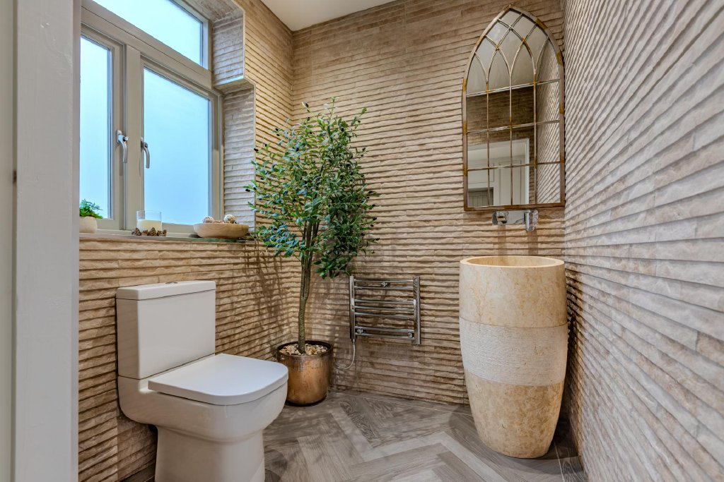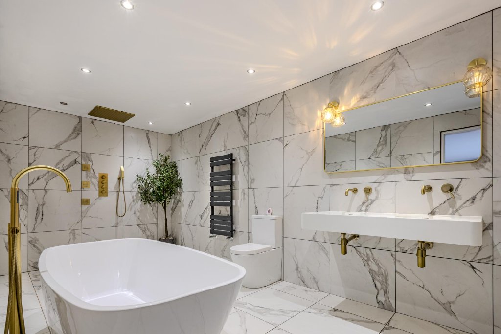 The first-floor hosts four beautifully proportioned bedrooms, two of which benefit from elegant en-suite facilities, in addition to a luxurious family bathroom. The principal bedroom is particularly impressive, enjoying a generous footprint and a striking feature window overlooking the front of the property. Its en-suite bathroom is finished to an exceptional standard, featuring a wet-room style shower, freestanding bath, twin basins, brushed brass fittings and floor-to-ceiling tiling, creating a refined, spa-like retreat.