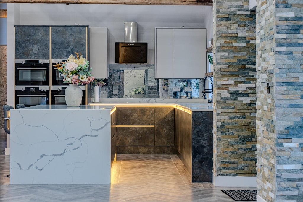 The entrance opens into an expansive open-plan hallway, exquisitely finished with elegant, panelled walls and underfloor-heated parquet flooring, setting the tone for the accommodation beyond. This space flows effortlessly into the breathtaking open-plan kitchen and dining area, forming the undeniable heart of the home. Bespoke luxury cabinetry, premium integrated appliances and an impressive central island are complemented by granite worktops, while soaring ceilings with exposed timber beams and striking full-height split-face mosaic tiling create a dramatic yet inviting setting, perfectly suited to both everyday living and entertaining. A generous utility room sits discreetly adjacent.