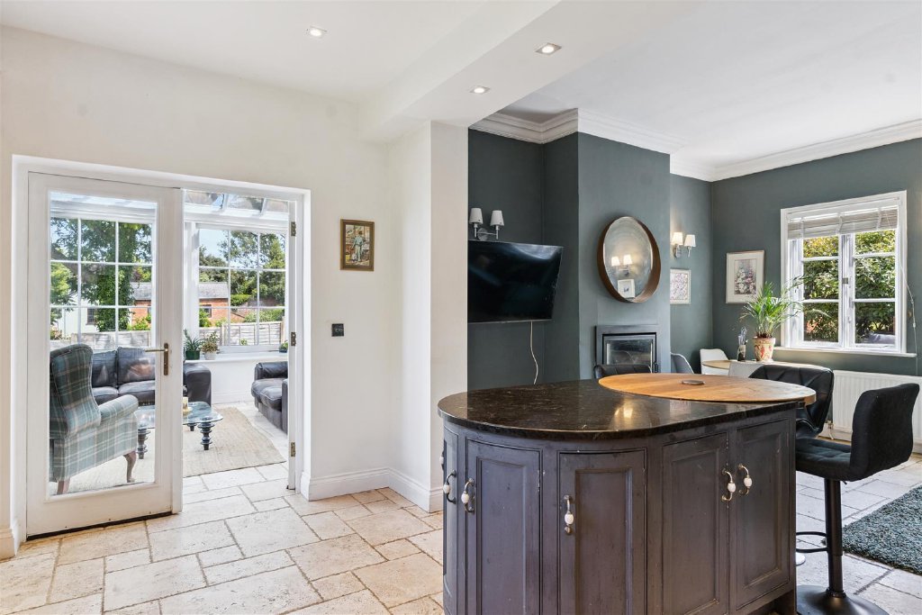 The kitchen/breakfast/family room is bright and airy with a window to front. Tiled flooring with part underfloor heating. Double doors to Orangery. The kitchen is fitted in a range of American Oak "Underwood" custom made floor and base level units which featured in 25 Beautiful Kitchens magazines. There is a built-in dishwasher, fridge and freezer, and space for a Range Oven. Double butler sink and black granite worksurfaces. Large centre Island. Open-plan to family room from the kitchen/ breakfast room. Two windows to side. Double sided wood burning stove which is fan powered to heat both the family room and the orangery.