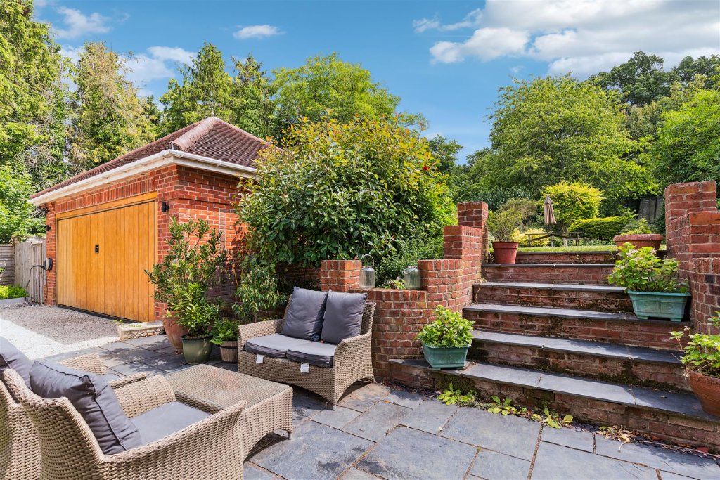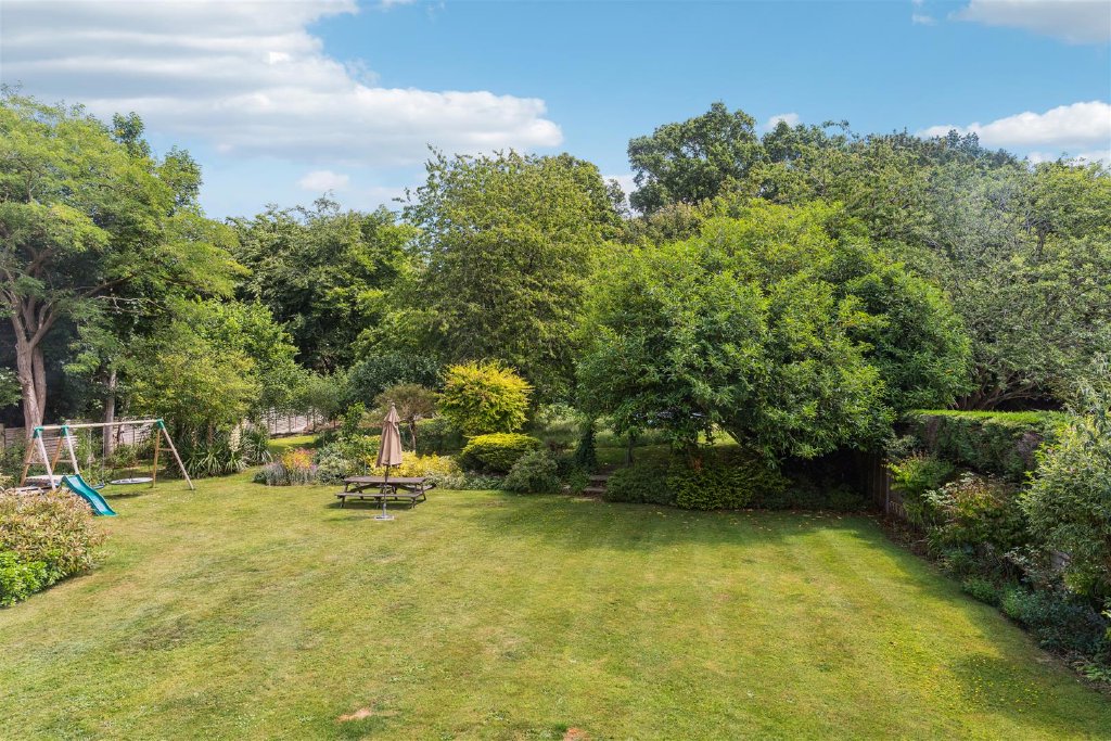 The large rear garden has a paved terrace area with steps up to an area of lawn with mature shrubs and planted borders. A vegetable area to the rear comprises three purpose-built raised beds and mature fruit bushes.