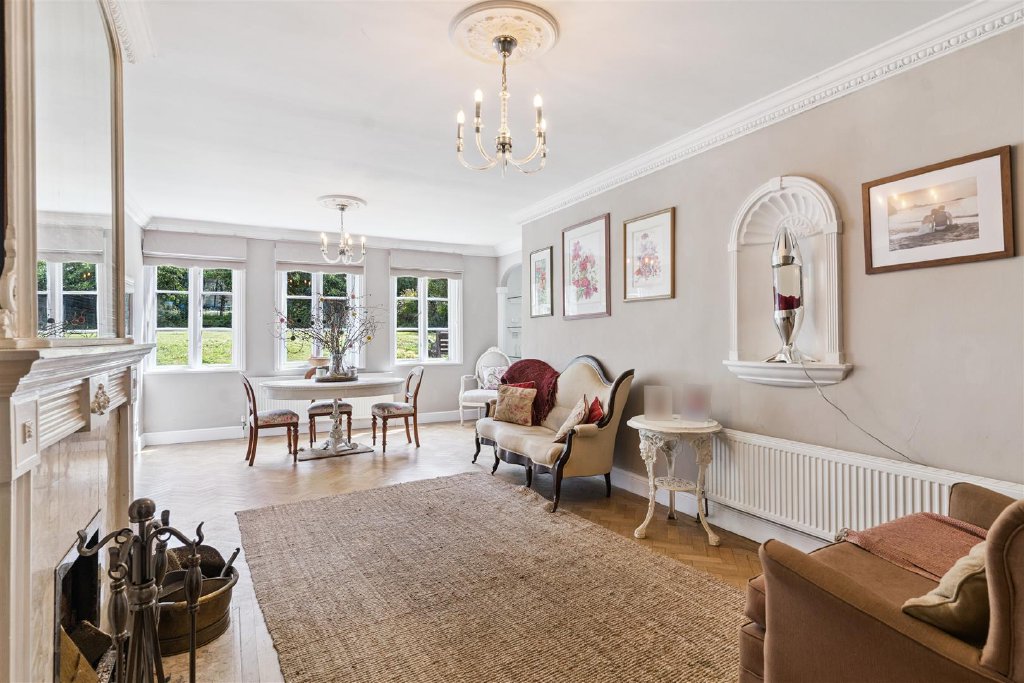 The spectacular entrance hall/dining hall has an open feature fireplace, light oak parquet wooden flooring, and windows to rear overlooking the beautiful rear garden. Door to utility room.