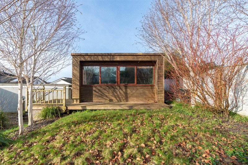 The private rear garden is enclosed by substantial walling and timber fencing, and has a raised lawn, a stone terrace, shrubs, and trees including birch and copper beech. Steps lead up to a substantial, insulated office/studio, largely of timber construction, with windows and a double glazed timber door.