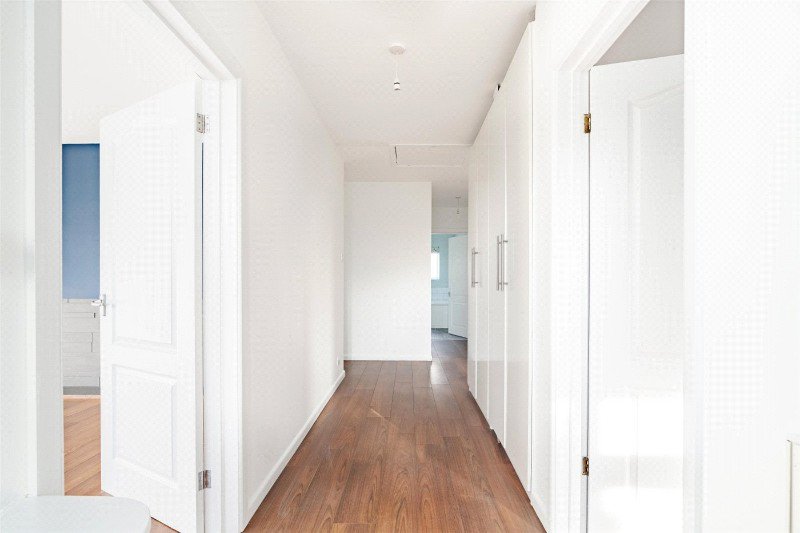Steps with a timber balustrade lead up to the front door. There is a large entrance hall with laminate flooring, loft access, and floor-to-ceiling cupboards, one of which houses the Glow Worm gas combination boiler.