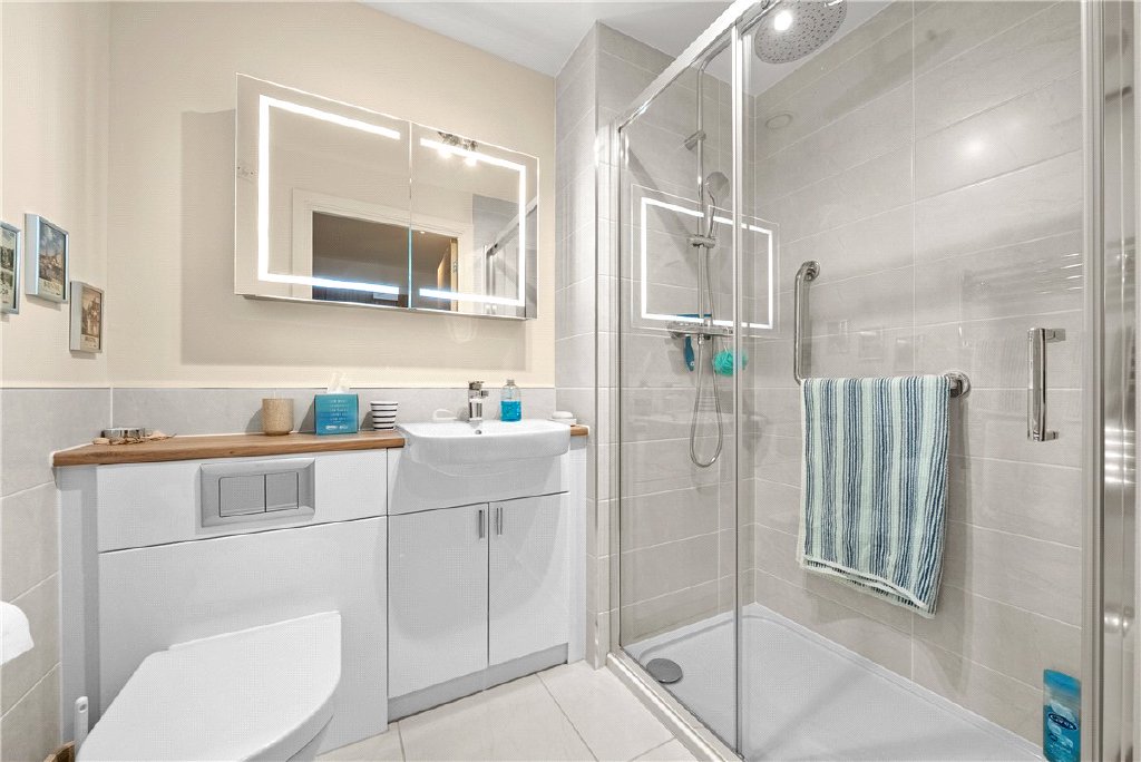 The principal bedroom is a spacious double enhanced by a walk in wardrobe and a private en suite that has been upgraded at additional cost to include a bath—an exceptional and rarely available feature within the development. The second double bedroom provides excellent versatility as a guest room, study or hobby space and is served by a modern family shower room.