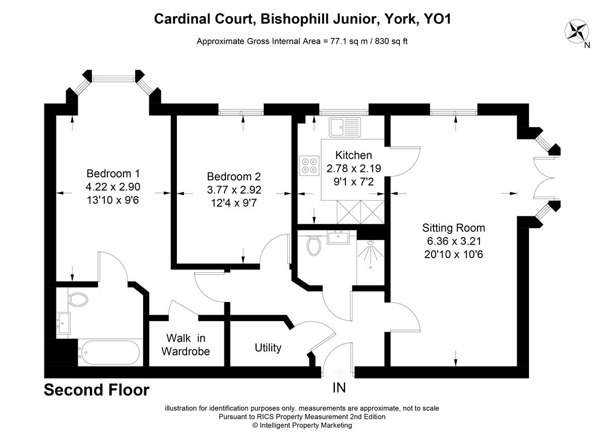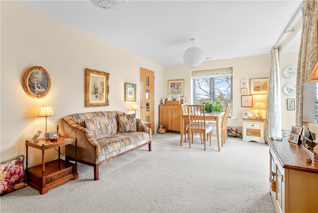 Elegant secondfloor over 60s apartment in soughtafter Cardinal Court, within York’s city walls. Light openplan living, upgraded ensuite with bath, second double bedroom, modern kitchen, parking, communal gardens, rooftop terrace and residents’ facilities.