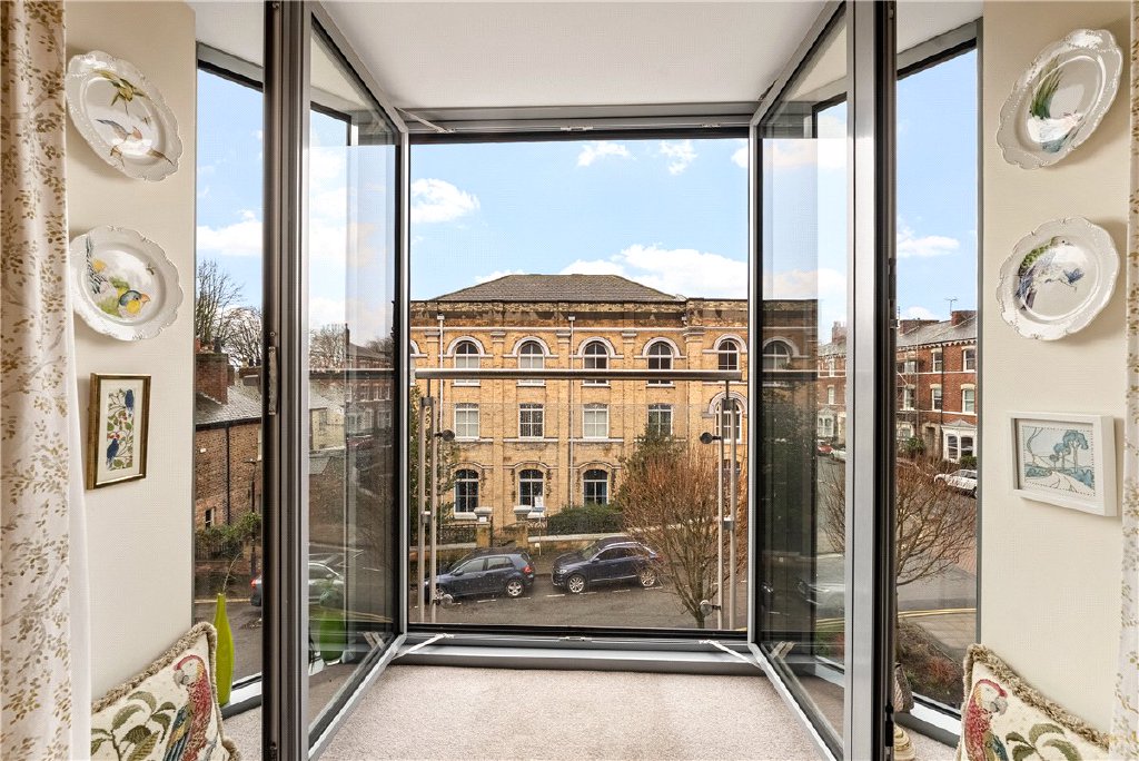 A generous entrance hall with a large utility and storage cupboard leads into an elegant open plan living and dining space, where dual aspect windows bathe the room in natural light and provide attractive views across the backdrop parkland and York’s ancient city walls. The contemporary kitchen, fitted with a full suite of integrated appliances, offers a stylish and highly functional setting for both everyday living and entertaining.
