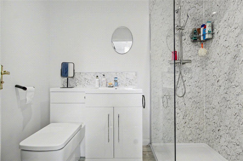 The family bathroom has also been recently refitted and features a panel-enclosed bath, wash hand basin with vanity storage and a concealed cistern WC, finished in a clean, modern style.