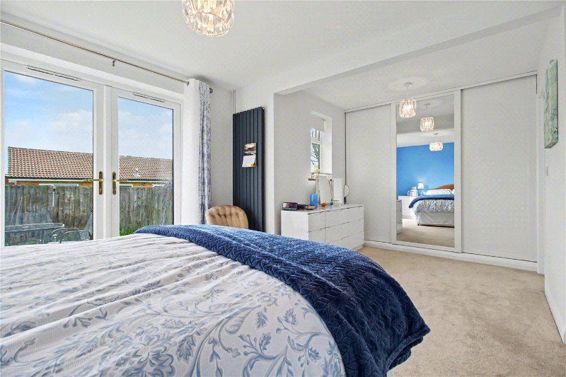 A wall of sliding, mirror-fronted wardrobes provide excellent storage, and a private en suite shower room is fitted with a contemporary vanity unit and close-coupled WC.