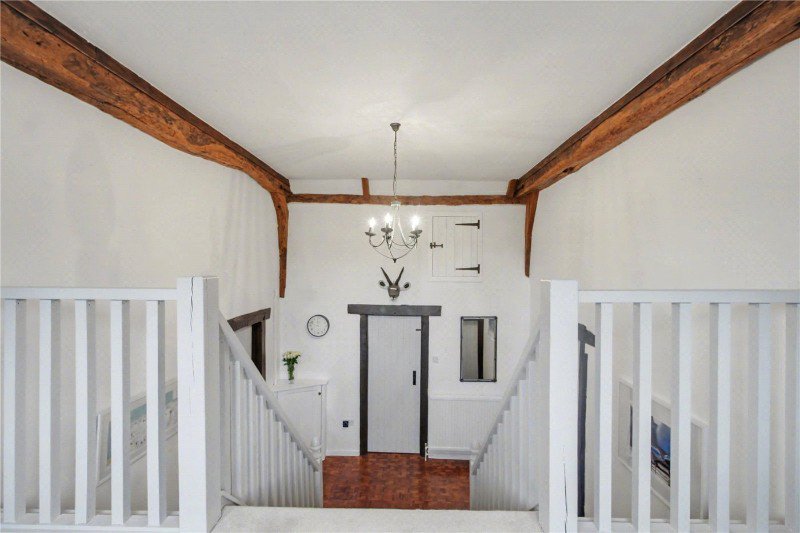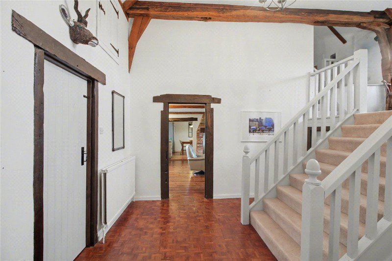 Internally, the accommodation within the main house extends to approximately 2,050 sq. ft. (excluding the outbuildings) and is arranged over split levels, providing flexibility and character throughout. A welcoming entrance porch leads into a dramatic central hallway featuring exposed beams, a central staircase and a striking double-height ceiling.