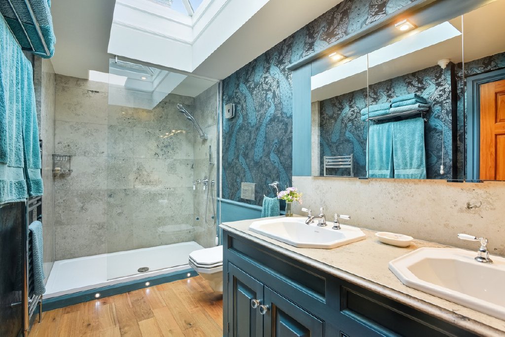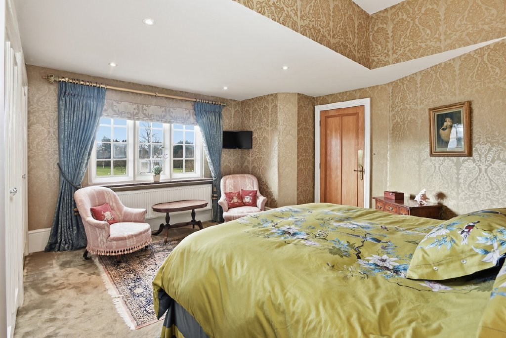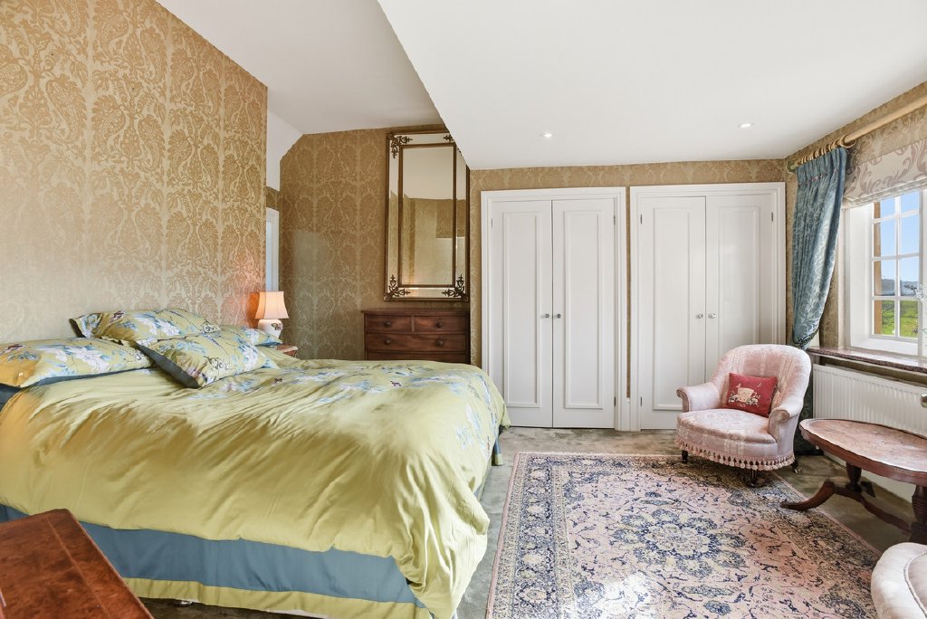 The elegant principal bedroom features fitted wardrobes, enjoys dual-aspect countryside views, and is served by a beautifully appointed en suite bathroom with a skylight.