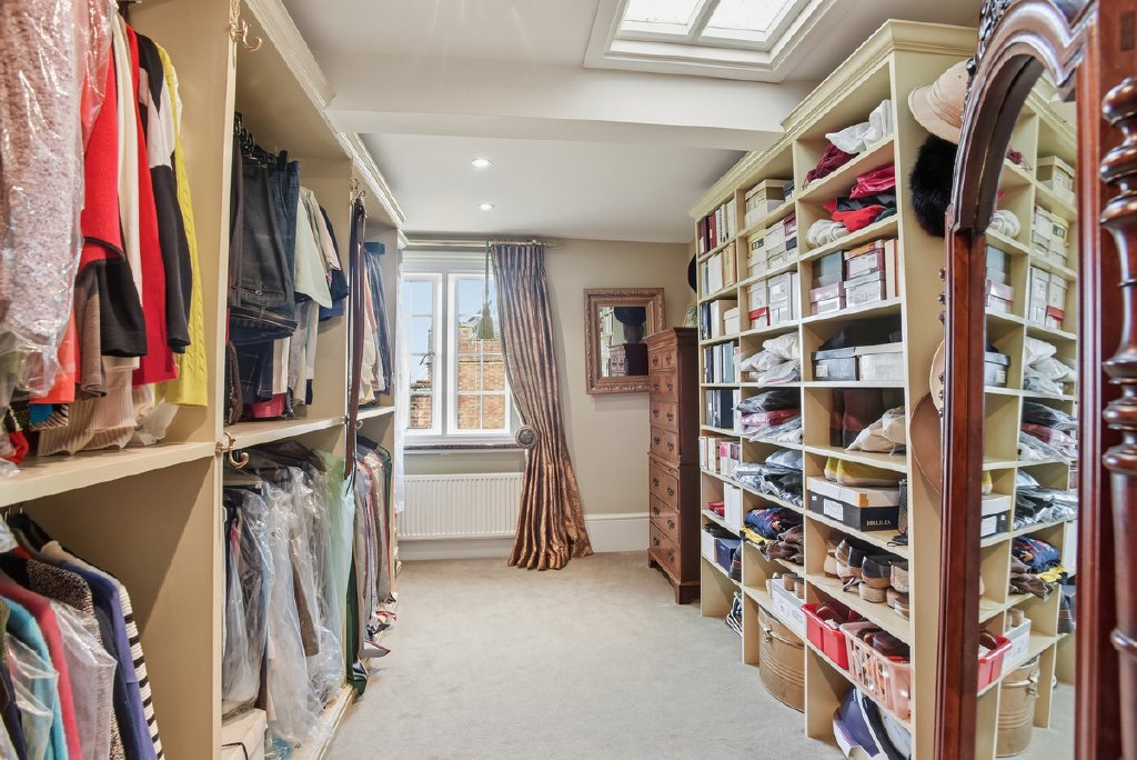 The second bedroom is a versatile room, currently arranged as a dressing area, and is fully fitted with hanging wardrobes and shelving, offering excellent storage while easily adaptable to other uses.