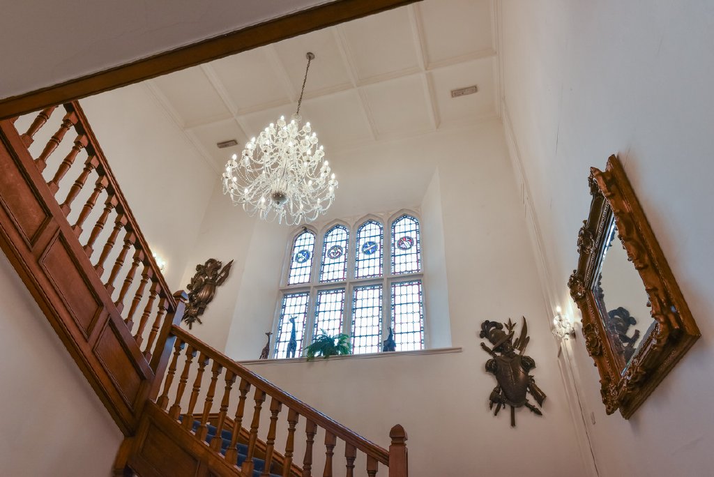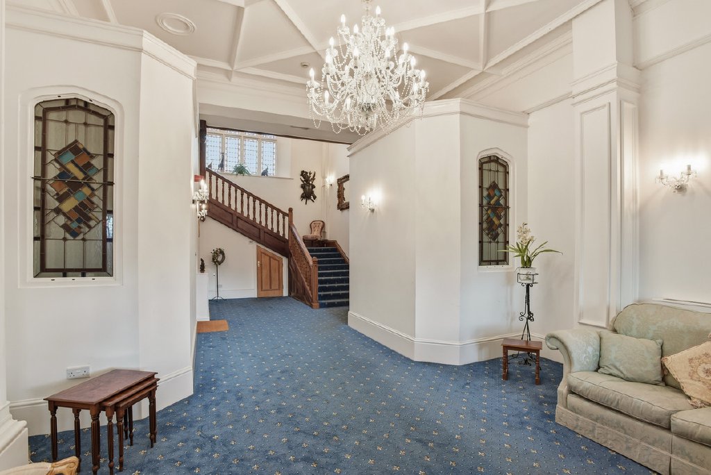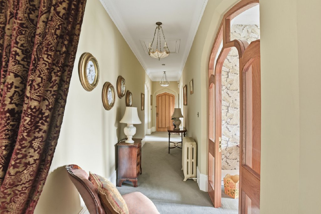 The apartment is accessed via an impressive communal hallway and sweeping staircase leading to the first-floor landing.