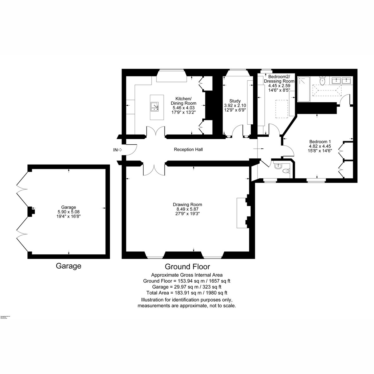 A flexible room, perfectly suited as a home office, library, or creative space, benefitting from a tall rear window and excellent natural light. The study is fitted with bespoke library shelving, enhancing both its character and functionality.