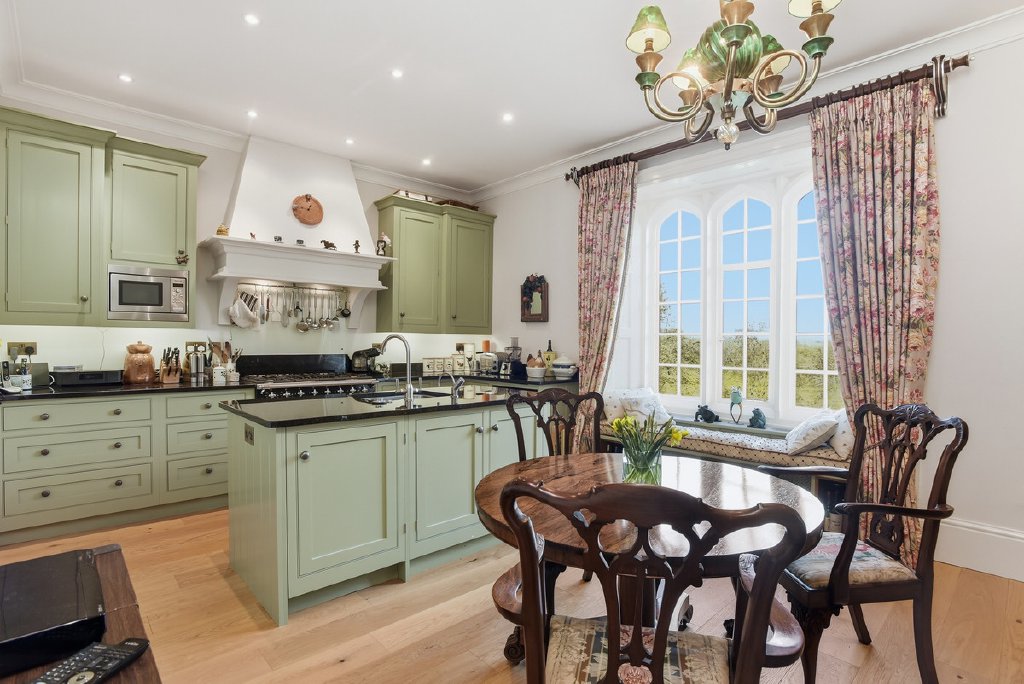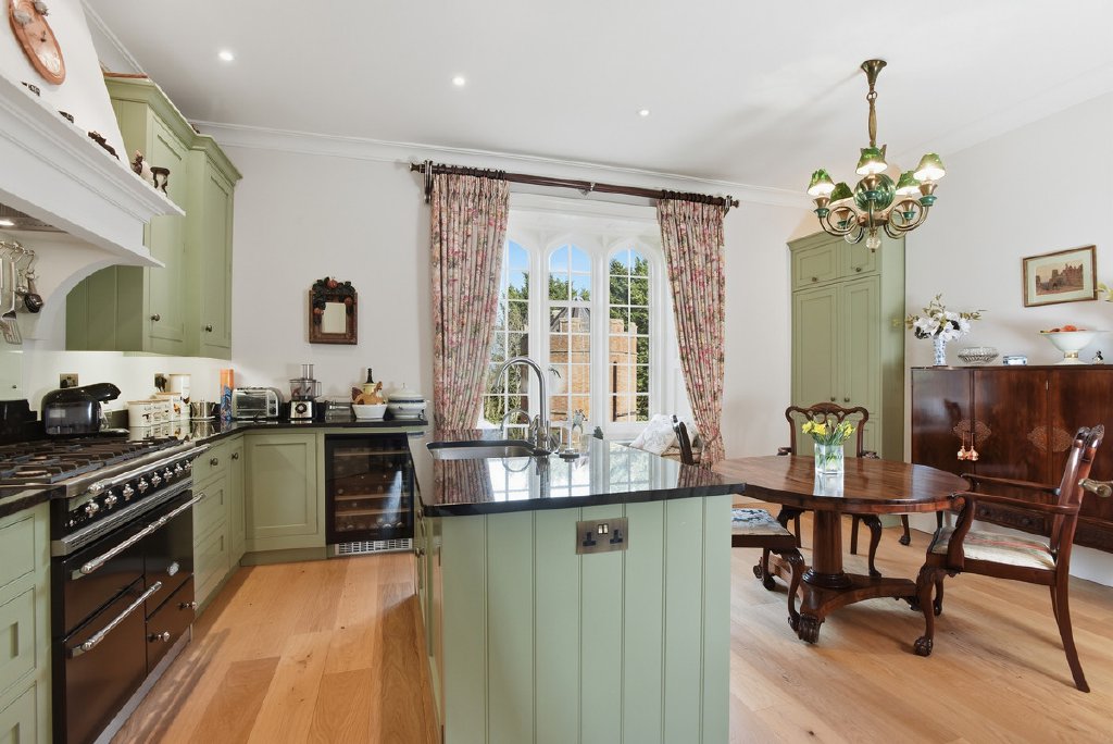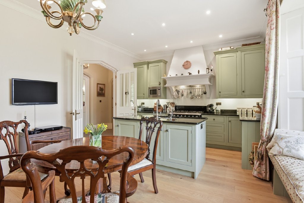 The beautifully crafted kitchen/dining room is superbly appointed with an extensive range of fitted cabinetry and premium integrated appliances, including a fridge/freezer, microwave, dishwasher, and drinks refrigerator. A statement Lacanche Range cooker forms an impressive focal point, complemented by a boiling water tap, waste disposer, and two full-height larder cupboards, creating a refined and highly functional space ideal for modern living.