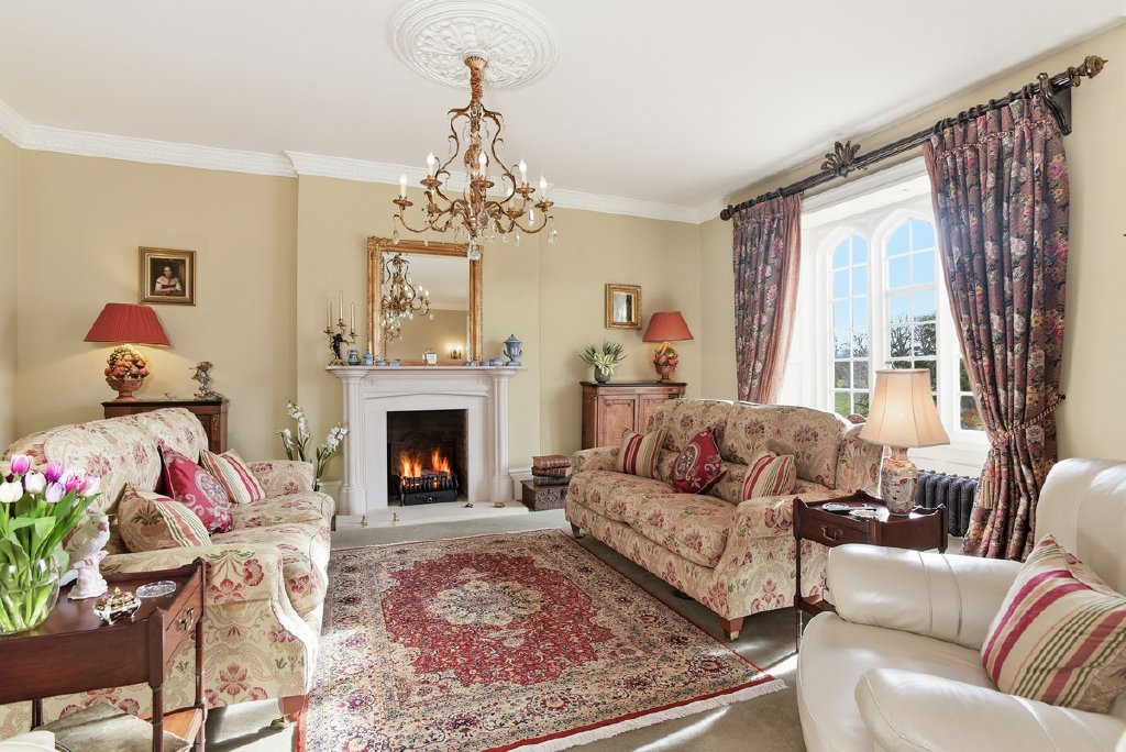 The beautifully proportioned drawing room features high ceilings and a fireplace, creating an attractive focal point.