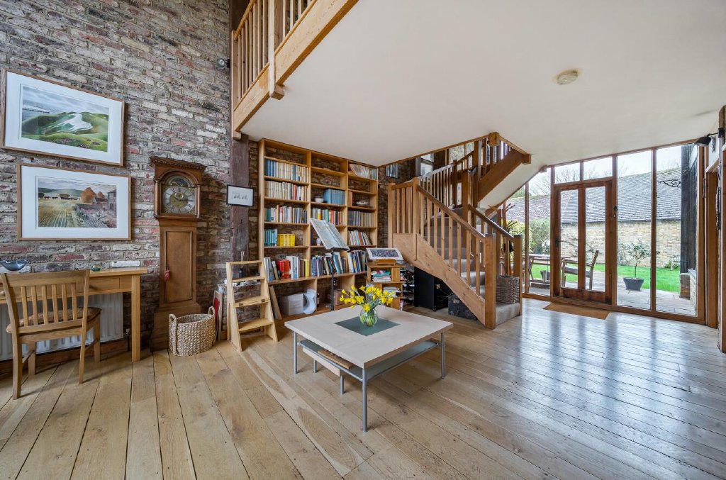 Soaring exposed timbers, brickwork and a dramatic full height entrance hall define the homes character. The original cart entrance, now glazed, draws light deep into the interior, creating an immediate sense of scale and warmth. From the reception hall, you ascend to a mezzanine gallery that enhances the architectural volume and provides an ideal study area overlooking the space below.