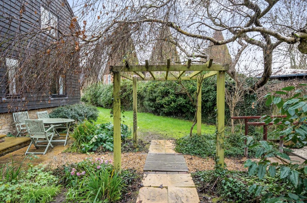 The ground floor is arranged for both entertaining and everyday life. The reception hall offers versatility as an additional sitting area and gives access to a useful storage cupboard and well appointed shower room. An L shaped sitting and dining room centres around a brick fireplace with inset wood burning stove, flowing seamlessly into a country style shaker kitchen designed with hosting in mind. A separate utility and boot room adds practicality, with direct access outside. Windows frame views of the gardens and neighbouring oast houses, ensuring a constant connection to the surrounding landscape.