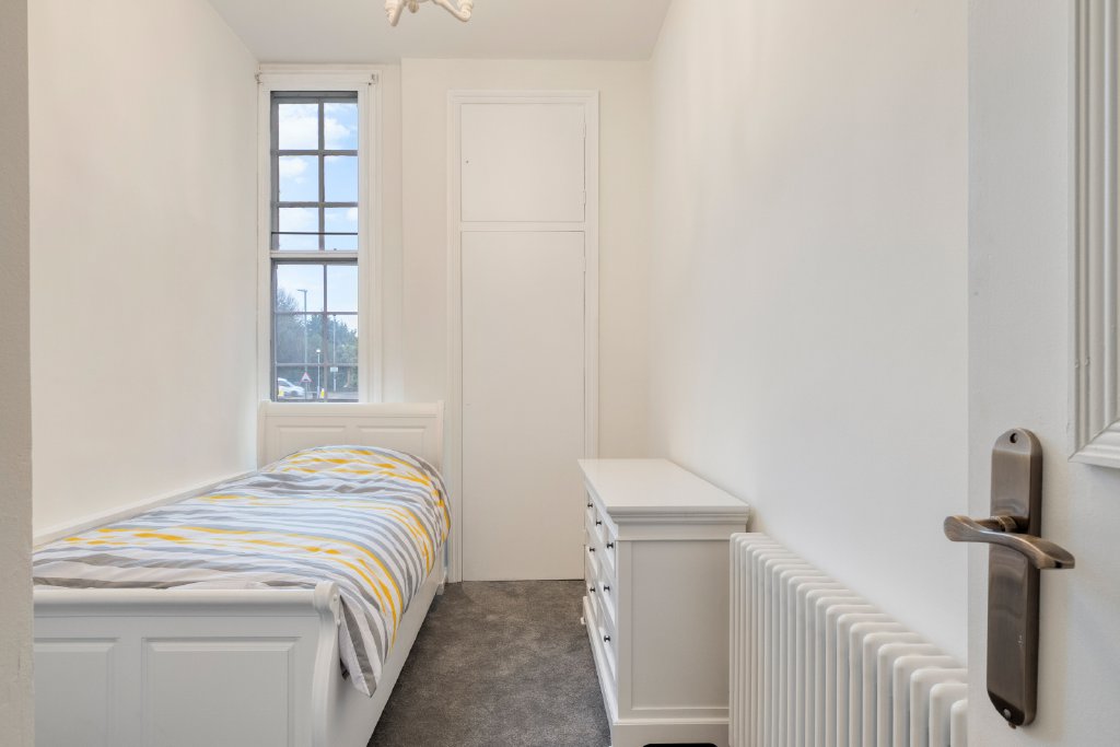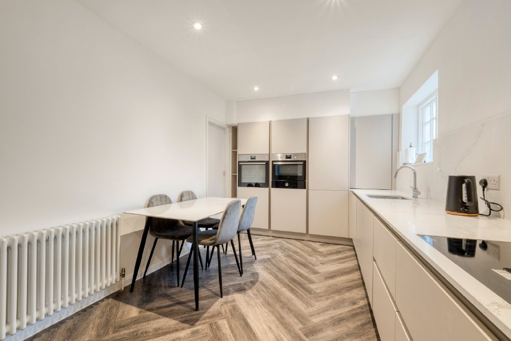 The welcoming entrance hall leads to a refined reception room, where large sash windows bathe the space in natural light, creating an inviting setting for both relaxation and entertaining. The well-appointed kitchen is stylish and functional, offering ample storage and quality finishes. Three well-proportioned bedrooms provide flexible accommodation, ideal for families, professionals or those seeking a dedicated home office. A tastefully designed modern bathroom completes the principal accommodation as well as a separate cloakroom for added convenience.