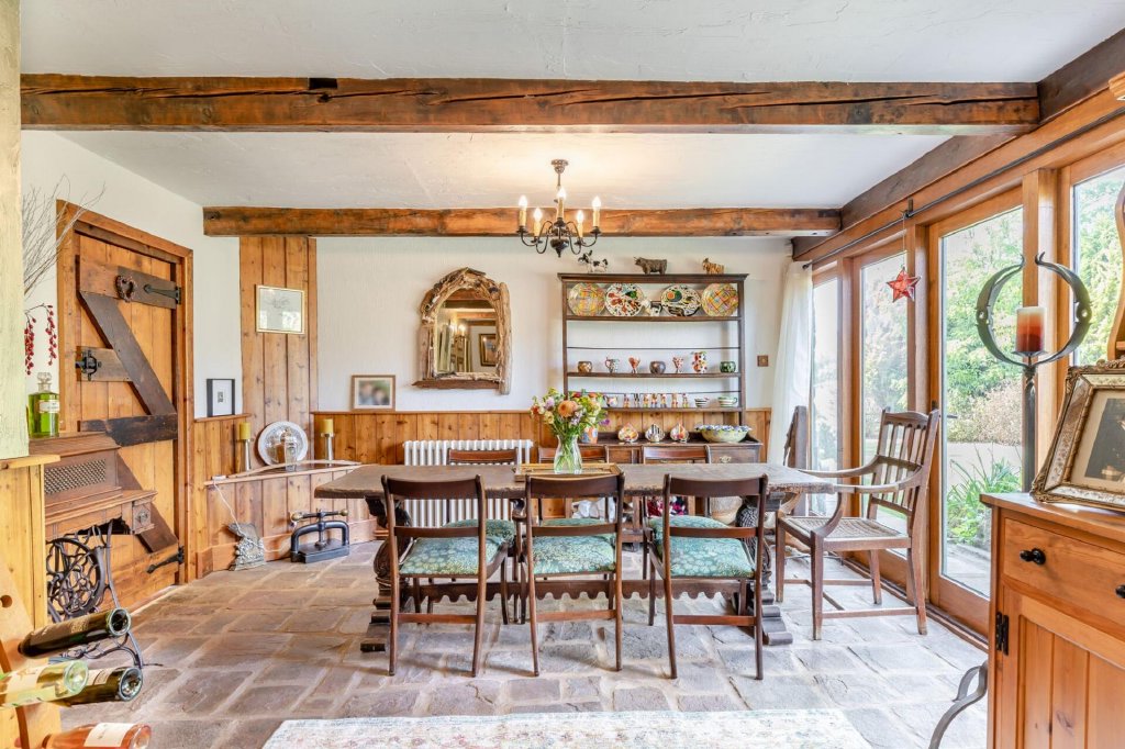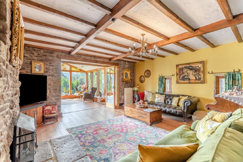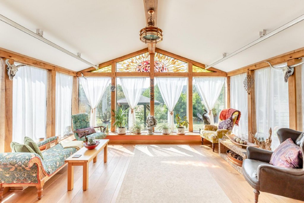 The main lounge exudes a darker, cosier atmosphere, complete with a stone open fireplace, perfect for winter evenings. From here, glazed bi-fold doors open into a stunning oak-framed garden room with a hand-painted arched window and glazing all around. A Jtul Scandinavian-style stove ensures this is a space to enjoy year-round.