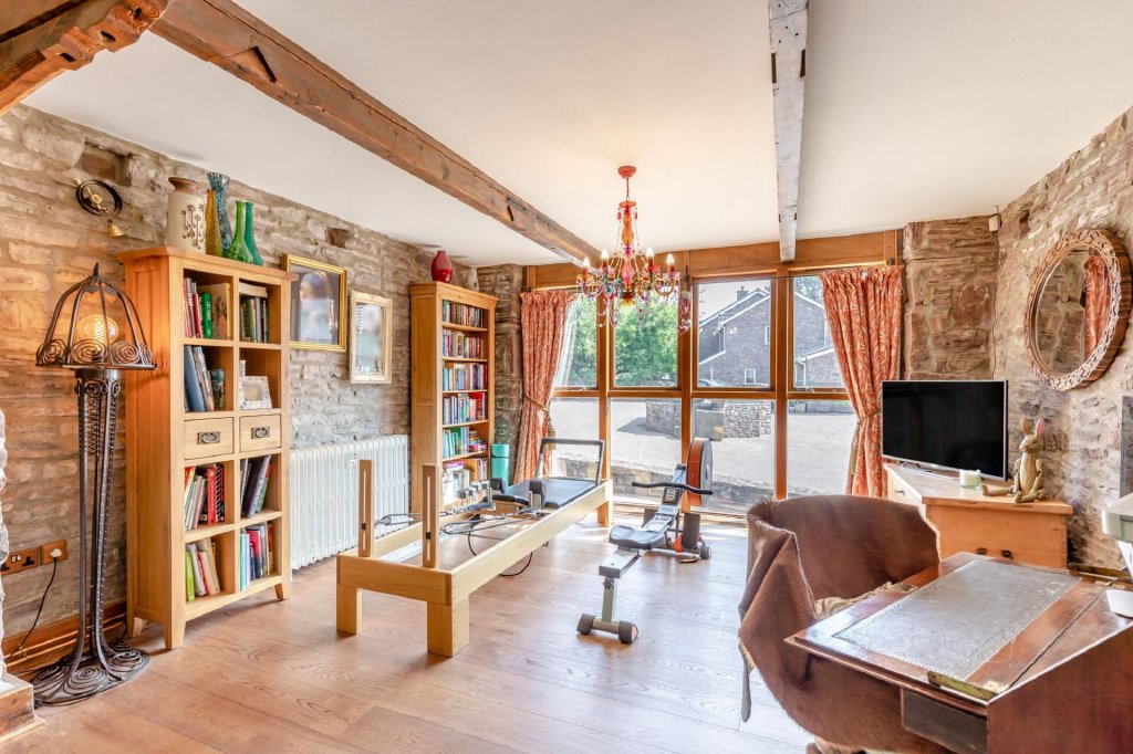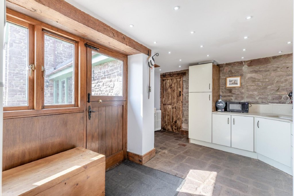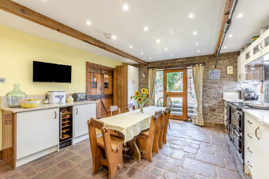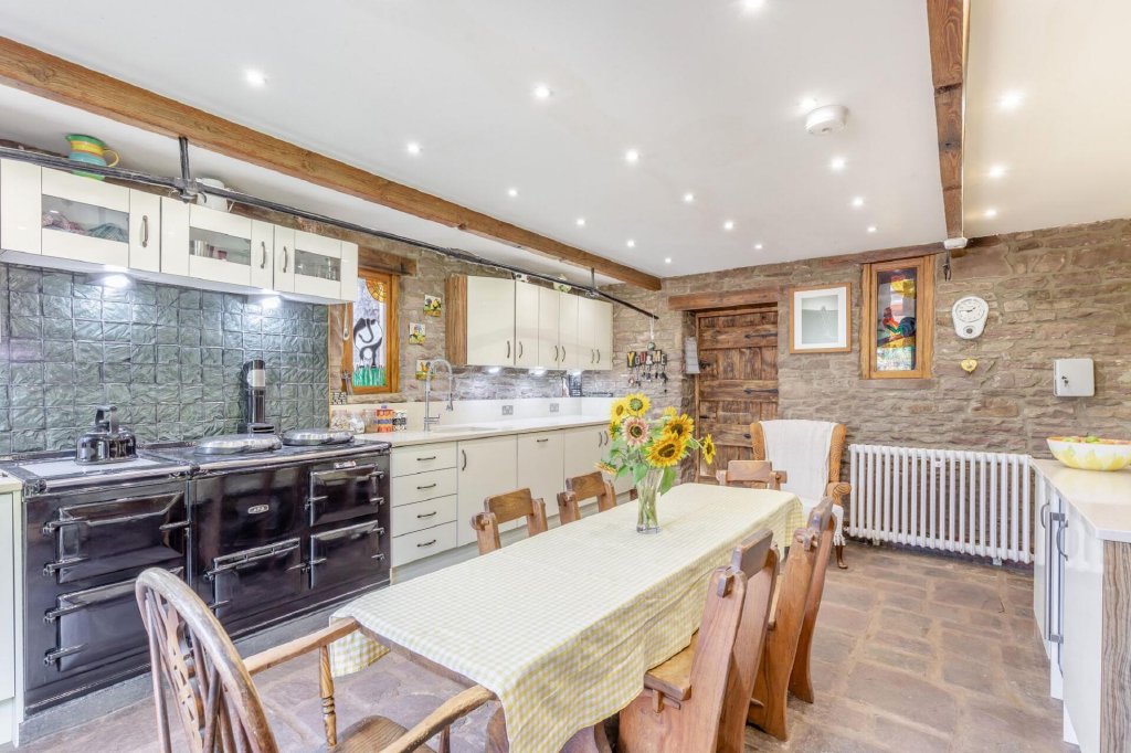 At the heart of the home lies the kitchen, where a classic oil-fired Aga takes centre stage, set on reclaimed Welsh slate flooring. Cream gloss units are paired with granite work surfaces, a Belfast sink, integrated appliances including a dishwasher, twin under-counter fridges, and a wine cooler. Reclaimed Victorian radiators run throughout the property, adding character and warmth.