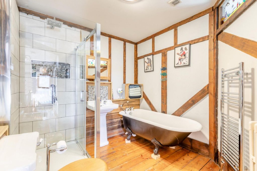 The family bathroom doesn't miss out on character either, with a ball and claw bathtub, separate shower, wash hand basin, and WC, all continuing the home's blend of charm and style.