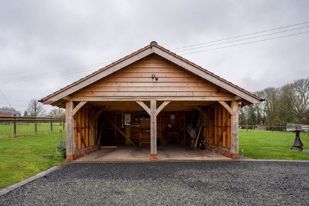 - Oak framed double garage with workshop, solar panels & battery