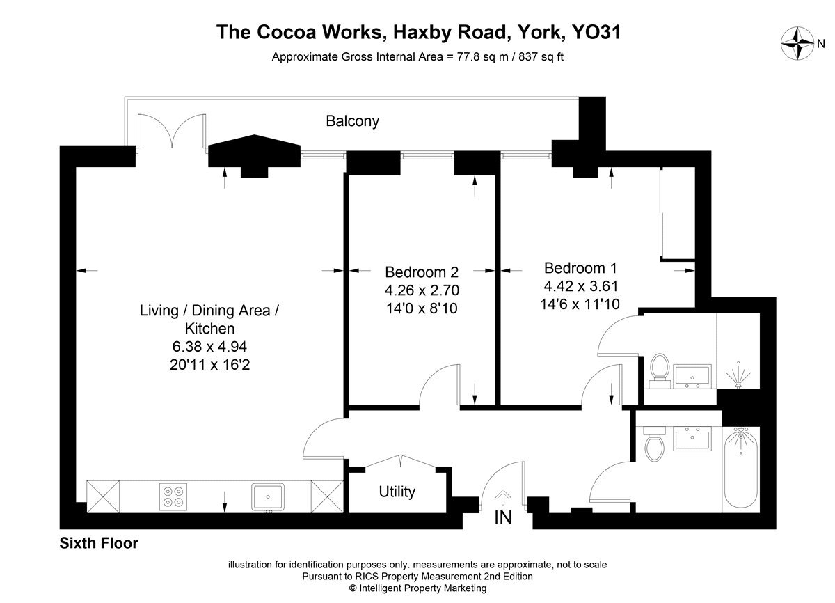 An exceptional sixth-floor apartment extending to approximately 837 sq ft, featuring a superb private balcony and forming part of The Cocoa Works, York’s landmark conversion of the historic Rowntree’s factory.