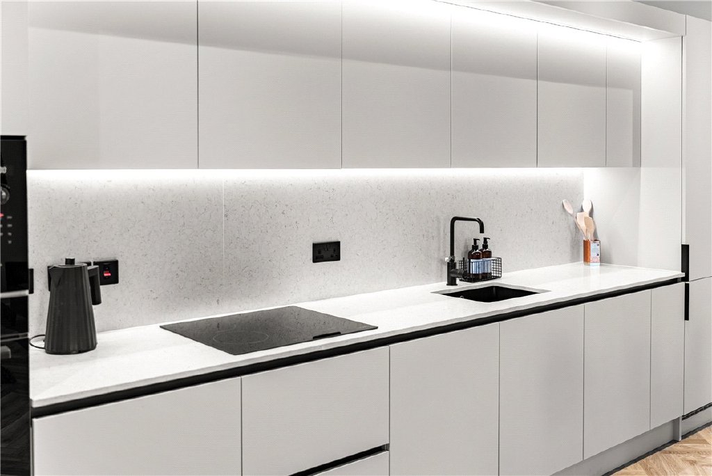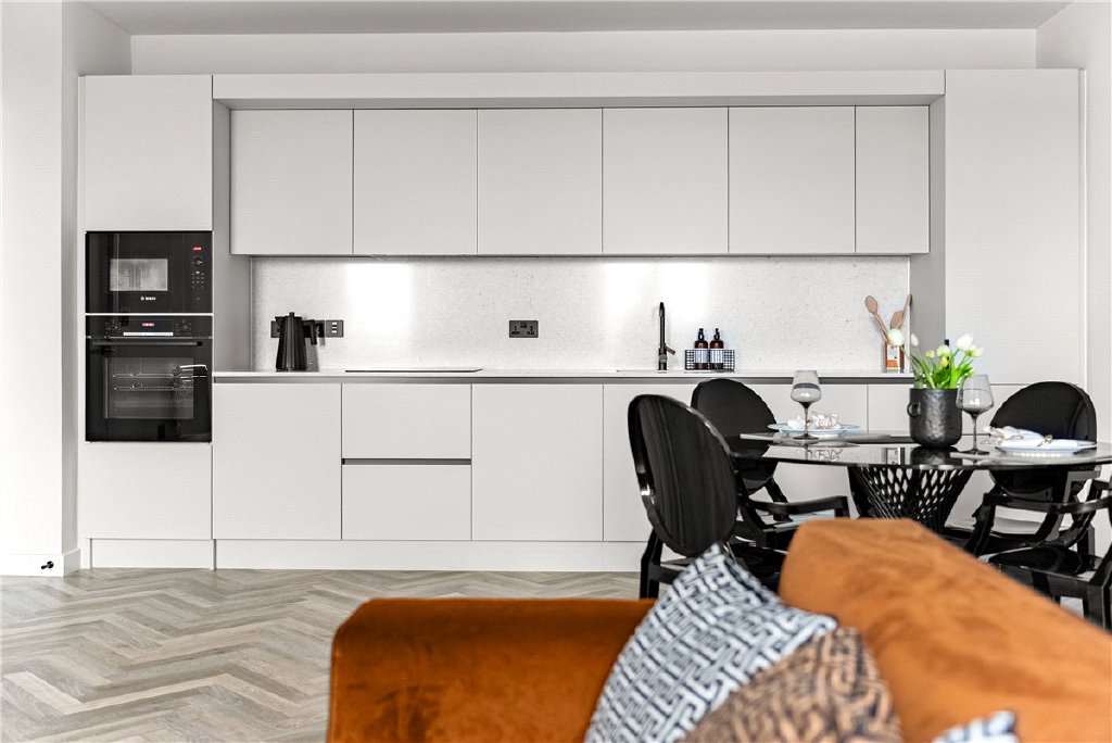 The accommodation is centred around an impressive open-plan kitchen, living and dining room extending to over 20 ft, providing a bright and highly versatile living space with direct access to the balcony, which offers elevated views across the surrounding area. The kitchen is fitted with a comprehensive range of integrated appliances and contemporary cabinetry, complemented by excellent storage including a separate utility area.