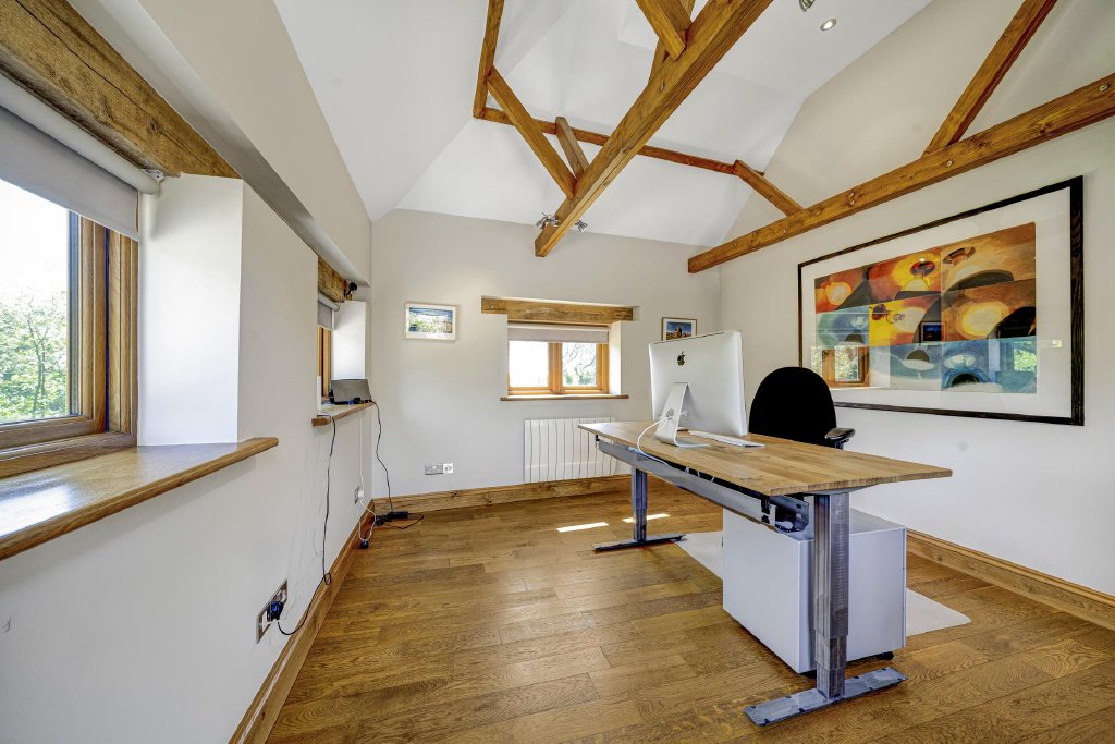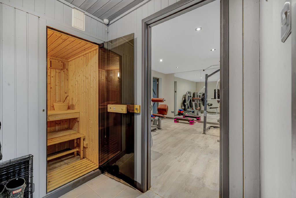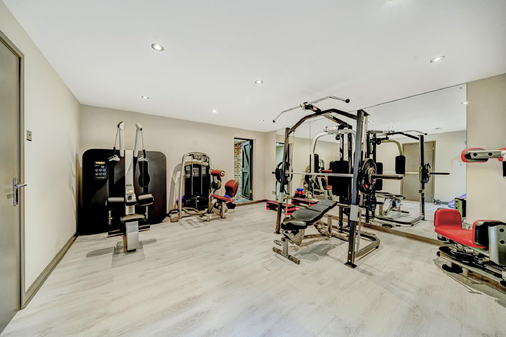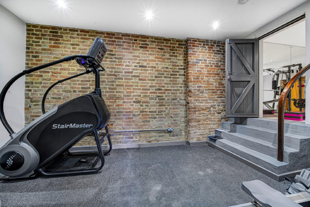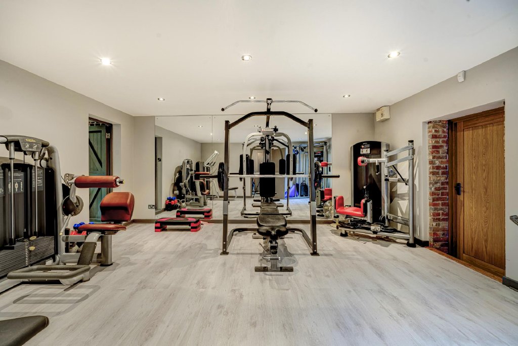 On the ground floor, accessed from the kitchen is the home gym with floor-to-ceiling mirrors. Also located in this area is the sauna and plant room housing the water tank and gas boiler. The gym leads to the Cardio suite, which is in the corner of the machinery barn. This area has been sympathetically adapted to create additional workout space.