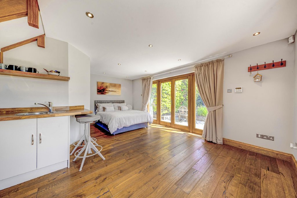 In addition to the main living areas, the property includes a practical office, a cloakroom, and a utility room. A well-proportioned guest suite/annexe further enhances the home's versatility, offering potential as an Airbnb or a self-contained retreat for visiting guests. This suite, which can be securely locked off from the main house, features its own garden access, an ensuite bathroom, a kitchenette, and a second-floor space for added convenience and privacy.