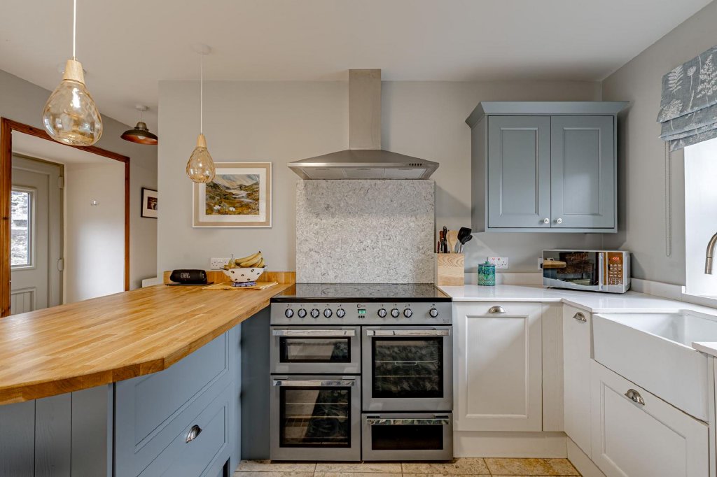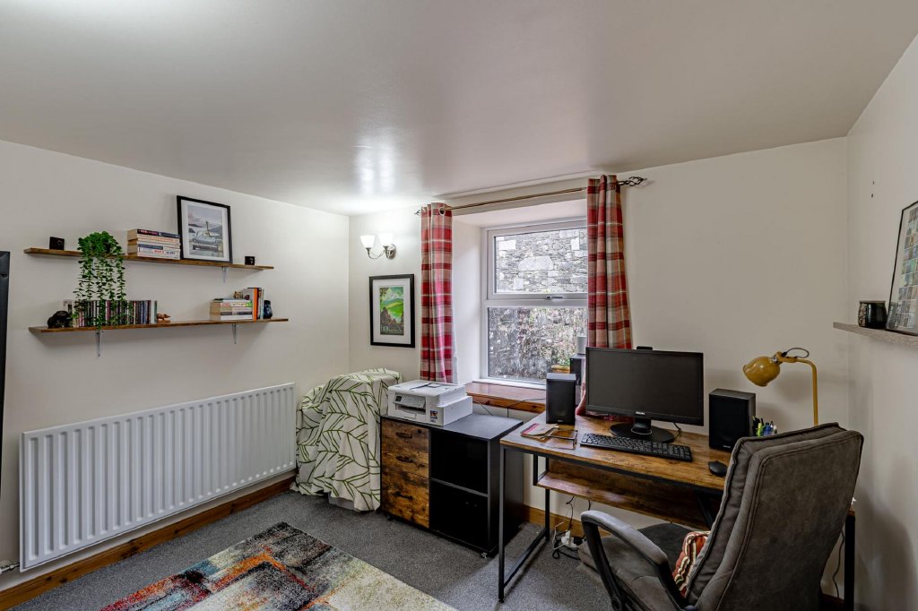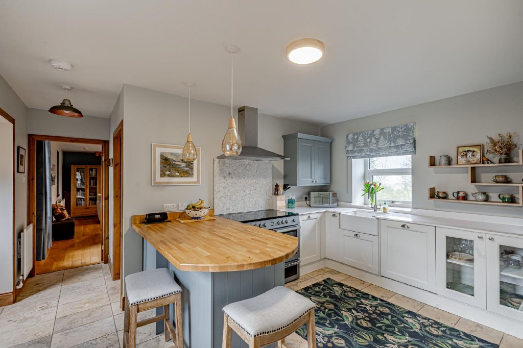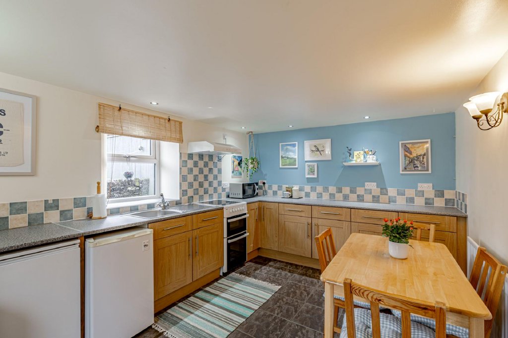The property is accessed directly from the front garden, with doors opening into both the kitchen and the sitting room. The kitchen is fitted with a cooker along with a good range of storage units and tiled splashback. There is space for dining furniture.