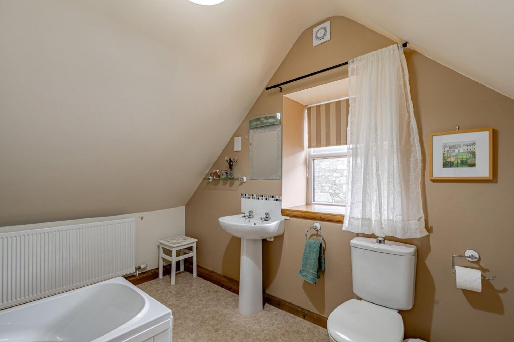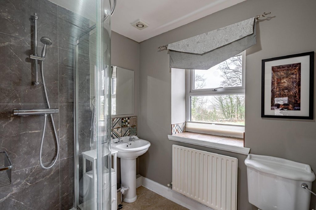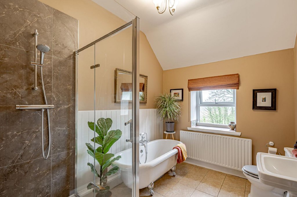 The family bathroom comprises a free standing rolltop bath with handheld shower attachment, and a separate, large shower cubicle, along with a wash hand basin and WC.
