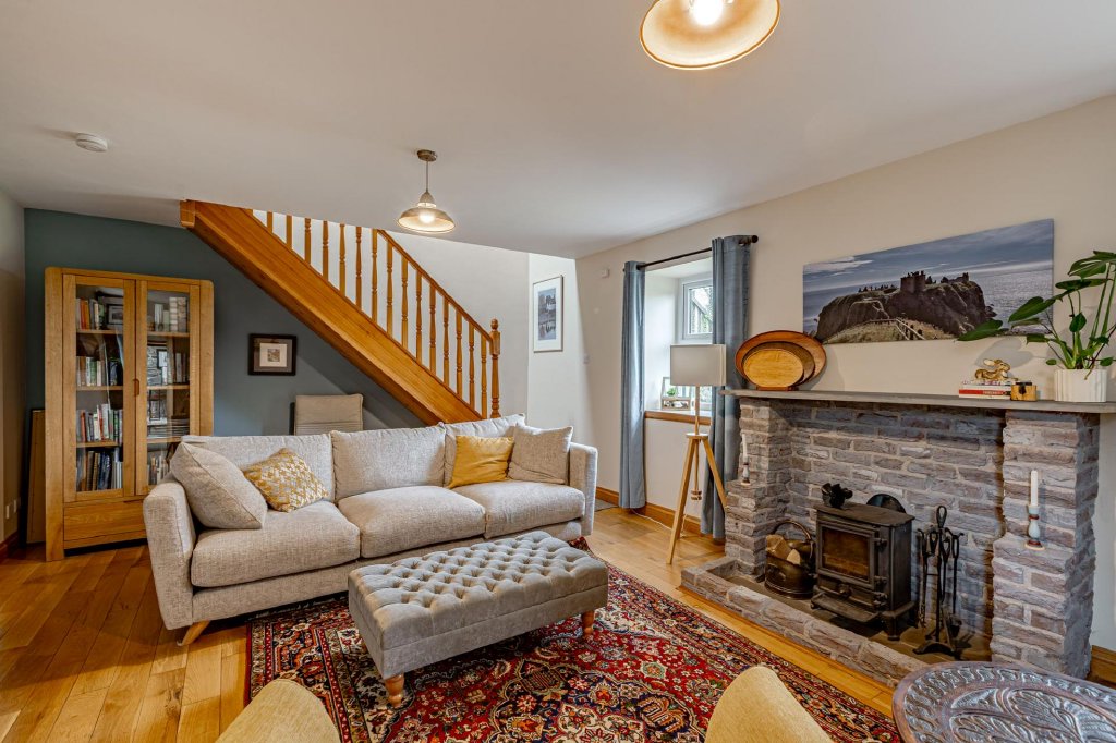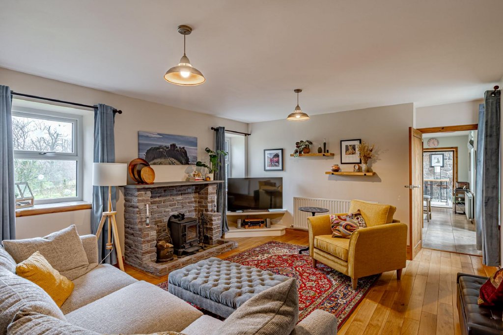 The sitting room is a welcoming and cosy space, featuring a solid oak floor, windows to front and rear and a cast iron wood burning stove with brick surround. A timber staircase rises to the first floor.