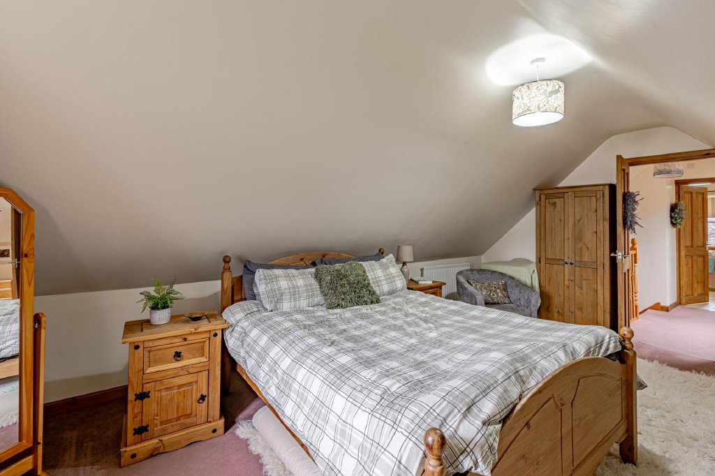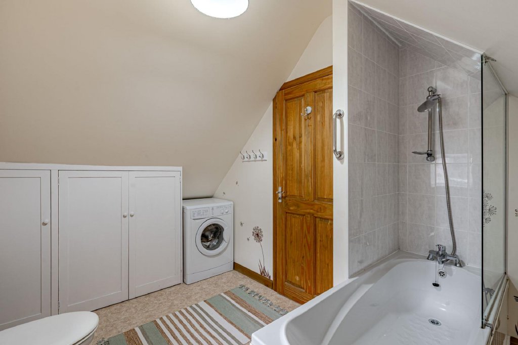 Upstairs, there is a spacious landing, a large double bedroom with sloped ceilings and eaves storage, and a generous bathroom, comprising bath with shower over, WC and wash hand basin. There is also a washing machine in this bathroom.