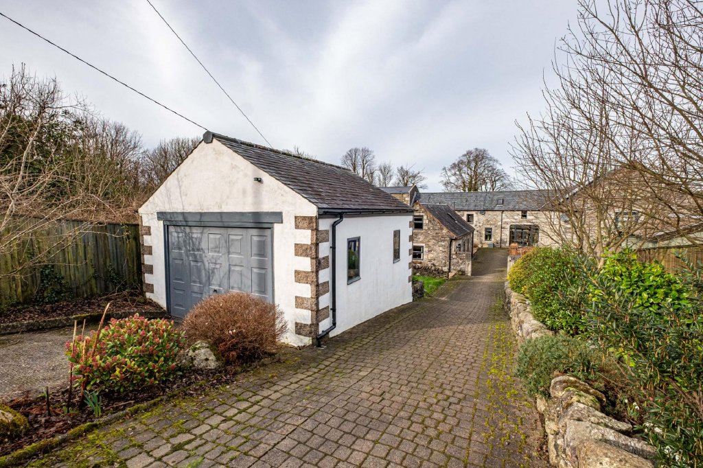 The property is approached via a shared driveway from the main road, which culminates in a generous private parking and turning area by the garage.