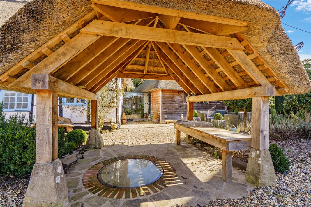 Electric gates with video intercom, open to a gravel drive and the gardens. Hedged borders give good privacy and a pathway skirts an attractive thatched well within the gardens leading to the original front porch and new glazed entrance. At the rear the pretty gardens continue, with level lawns and good quality shed and store.