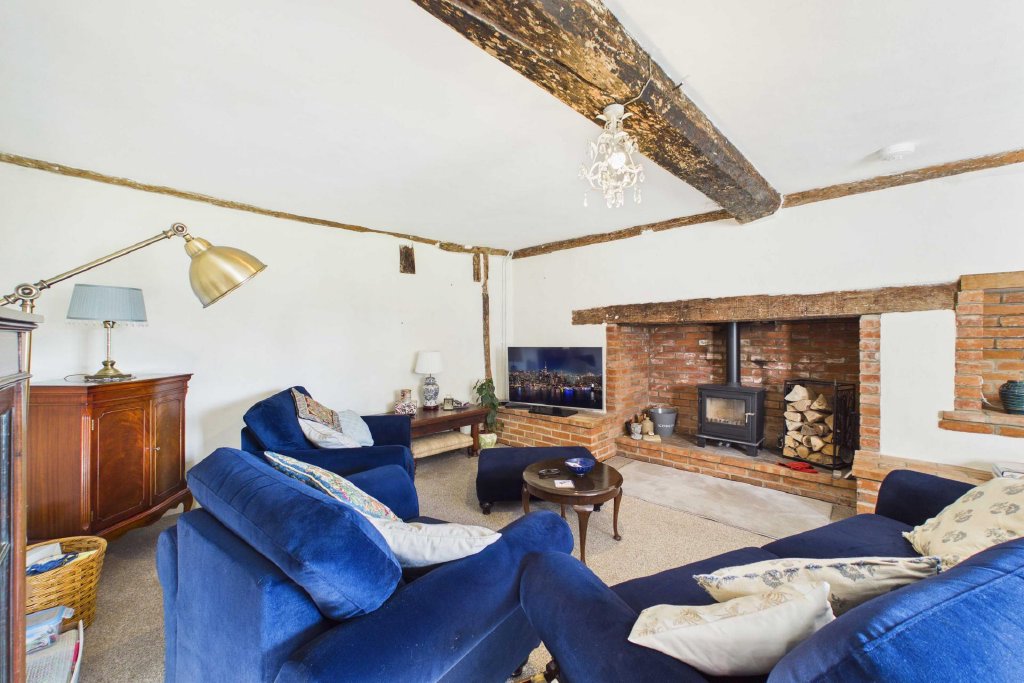 SITTING ROOM 18' 1" x 13' 6" (5.52m x 4.13m) Brick feature Inglenook fireplace with Bressemer beam incorporating woodburning stove on brick hearth, brick feature shelving. Exposed Joist and studwork; radiator; curtains with matching Roman blind to window; fitted carpet.