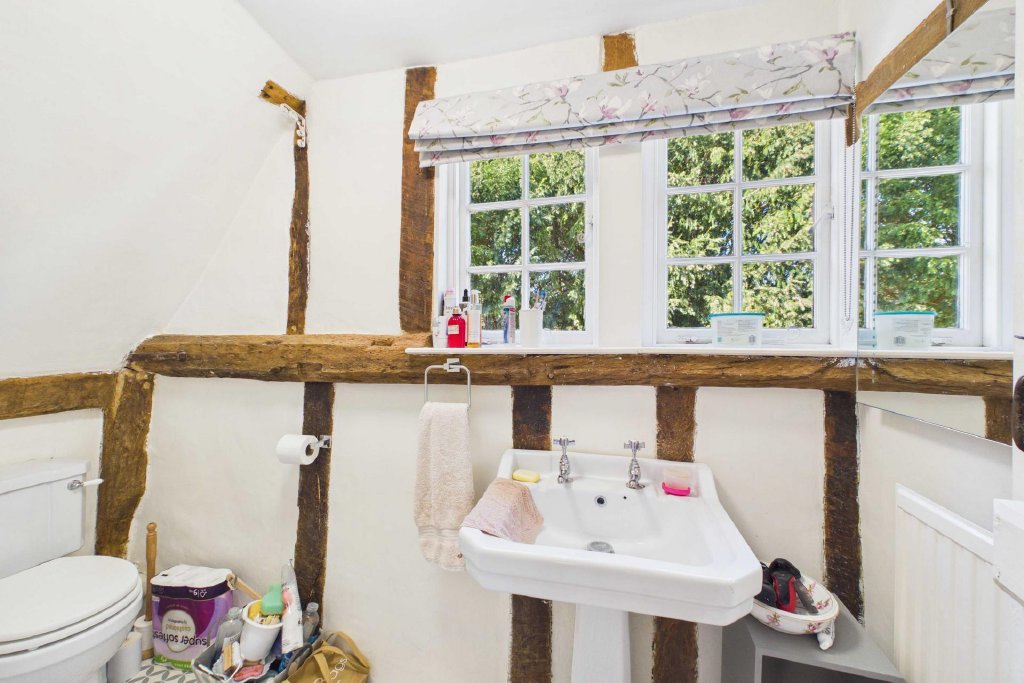 BATHROOM With exposed joists and stud work; sloping ceiling; Windows to side aspect with Roman blinds; panelled bath, pedestal wash basin and WC; radiator; cushion flooring.