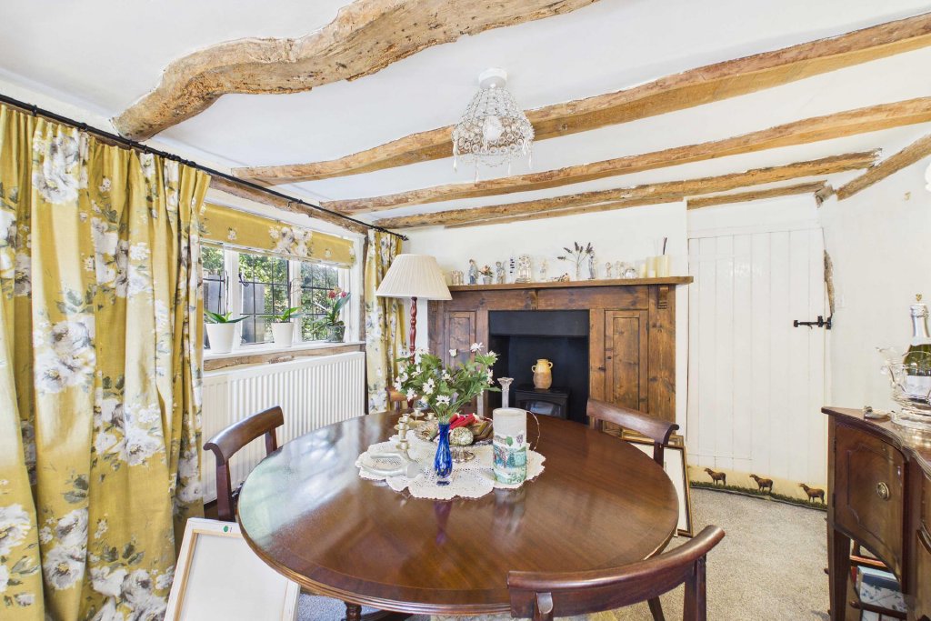 DINING ROOM 17' 3" x 10' 5" (5.26m x 3.18m) With exposed beams, joists and studwork; Roman blinds to Double aspect windows and curtains to one window; radiator; matching wall lights; fireplace and brick hearth with timber surround incorporating two small cupboards. Secondary staircase to first floor. Door to: