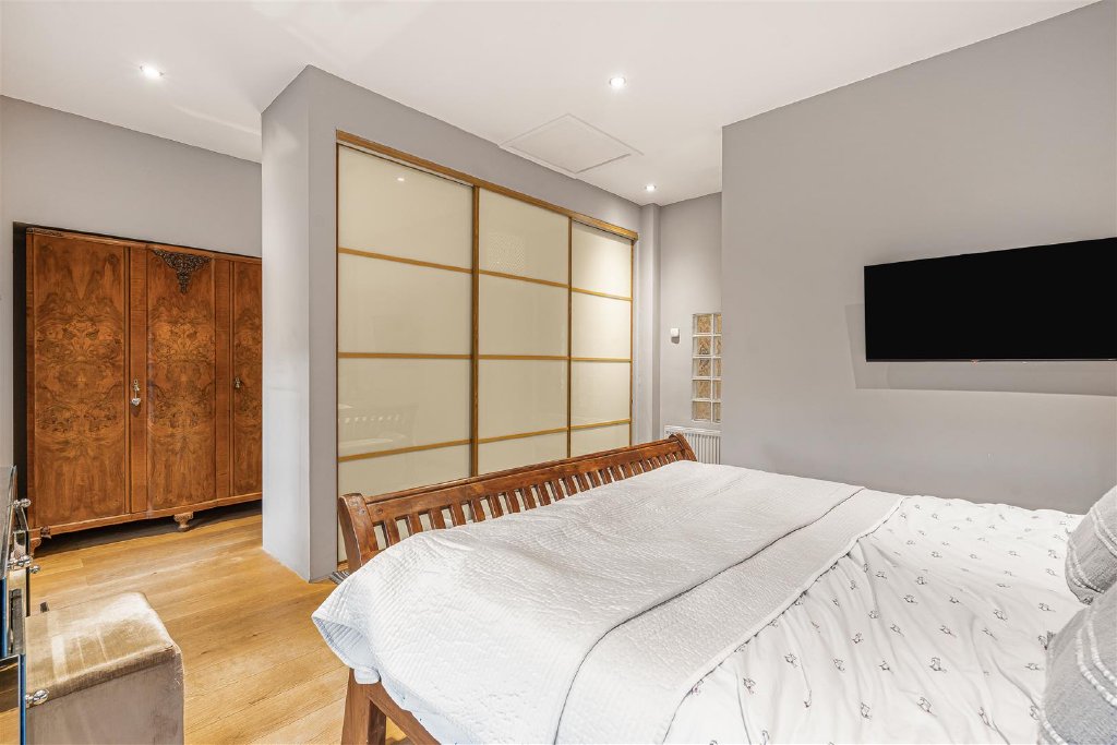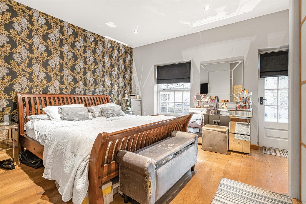 The sitting room is worthy of special note, with high ceilings, large windows and French doors leading to the attractive rear garden, along with a stunning feature fireplace with a welcoming wood-burning stove It feels both elegant and spacious.