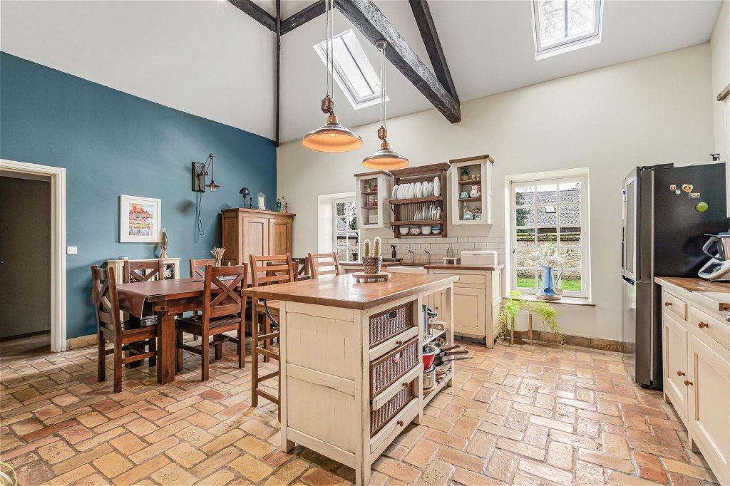 Large windows, and roof lights flood the kitchen with natural light, and the vaulted ceiling makes for a lovely room to enjoy entertaining with friends and family.