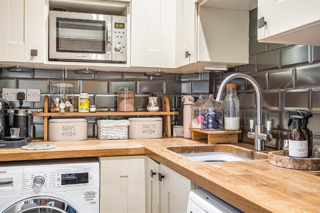 A practical utility room with a door to the side garden sits just off the kitchen.