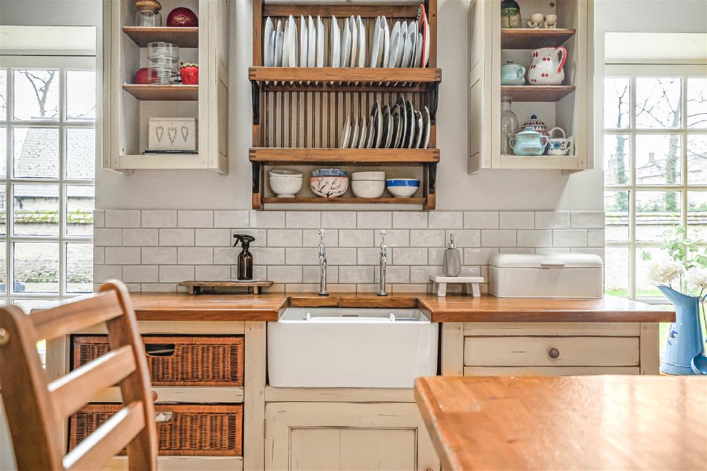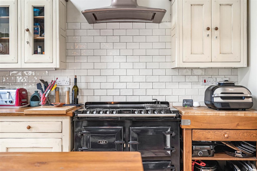 The entrance hallway has a large storage cupboard for coats and boots, and leads to the kitchen/breakfast room, which is fitted with farmhouse-style units and an AGA.