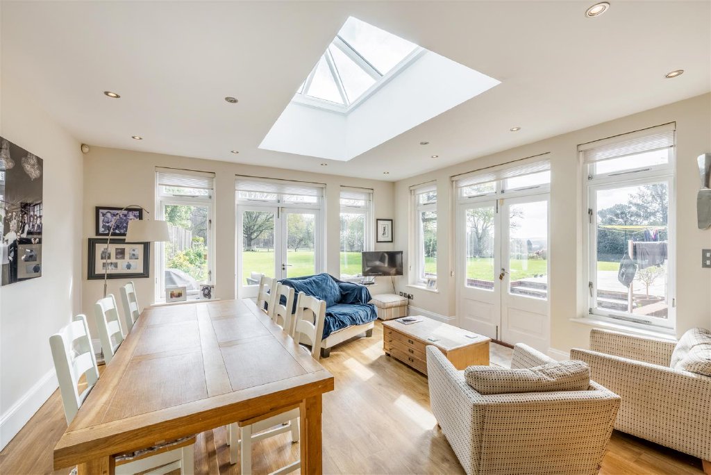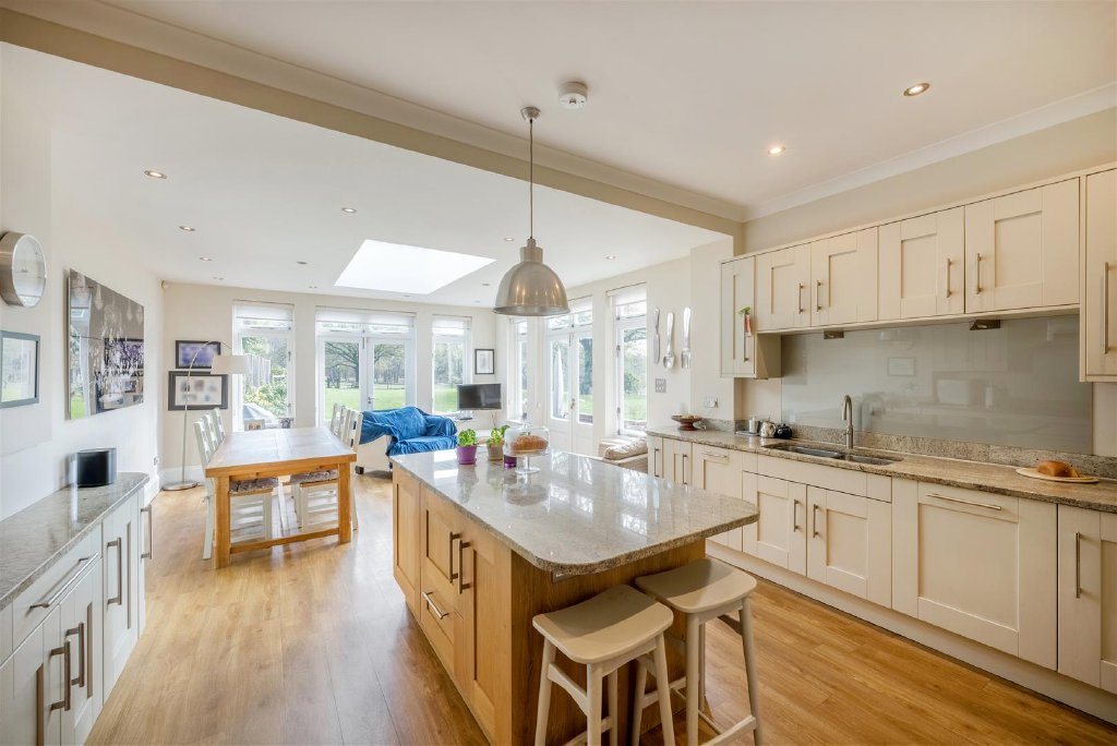 At the heart of the home is the kitchen breakfast family room, designed for both everyday living and entertaining. Fitted with a comprehensive range of wall and floor units, granite worktops and a central island with breakfast bar and wine cooler, it is a space where family and friends naturally come together. Two sets of French doors open onto the terrace, filling the room with light and extending living space into the garden. A cloakroom completes the ground floor.